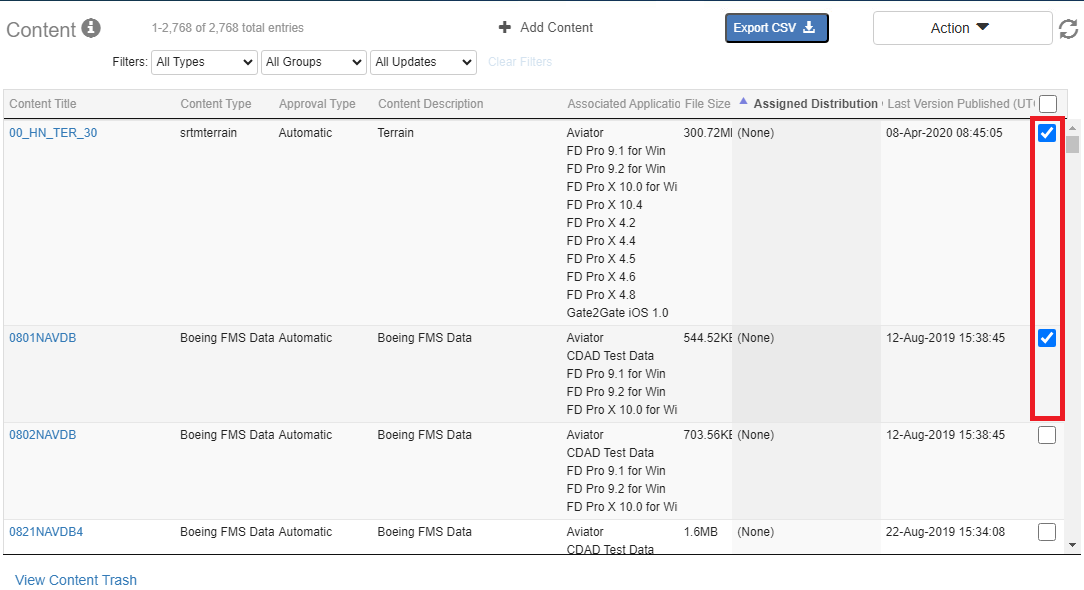 From the Content page, select the checkbox for each content