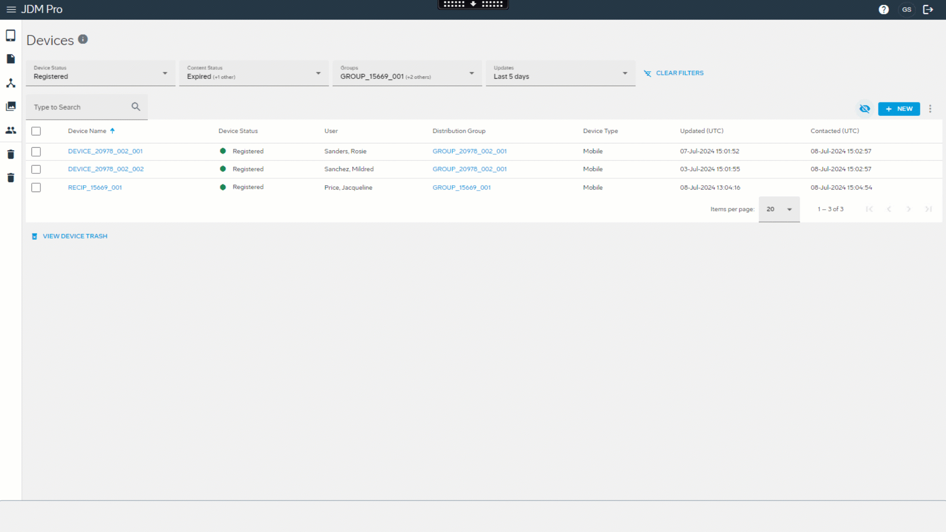 - Apply filters. Filters include Device Status, Content
