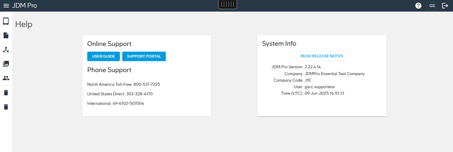 The Help page provides access to the online version of the JDM Pro Application Administrator Guide, the Jeppesen Digital Success Site, and the latest Release Notes.